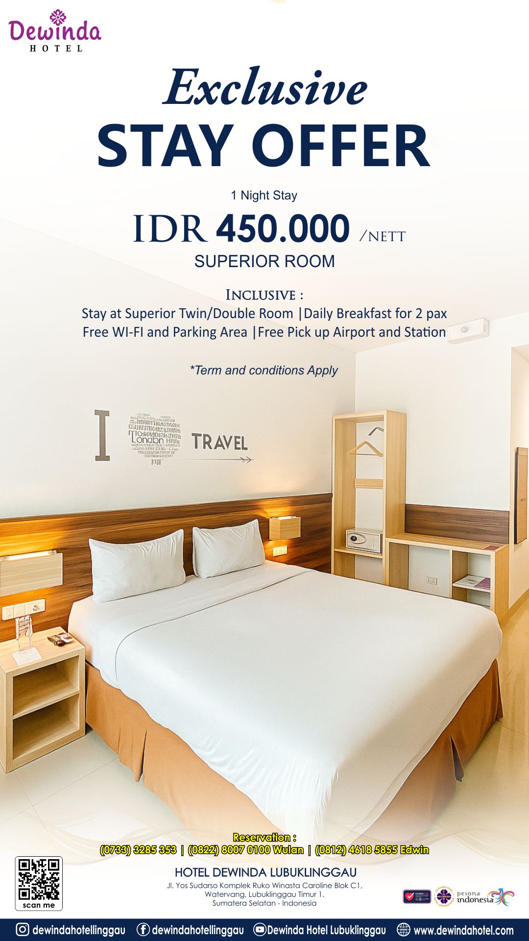 Siap staycation nyaman dengan harga spesial? ✨Ini saat yang tepat buat kamu rehat sejenak dan nikmati pengalaman menginap yang hangat, bersih, dan penuh kenyamanan di Dewinda Hotel Lubuklinggau 🤍 EXCLUSIVE STAY OFFERNikmati 1 Night Stay hanya IDR 450.000 nett di Superior Room yang modern dan cozy cocok untuk liburan singkat, perjalanan bisnis, maupun quality time […]