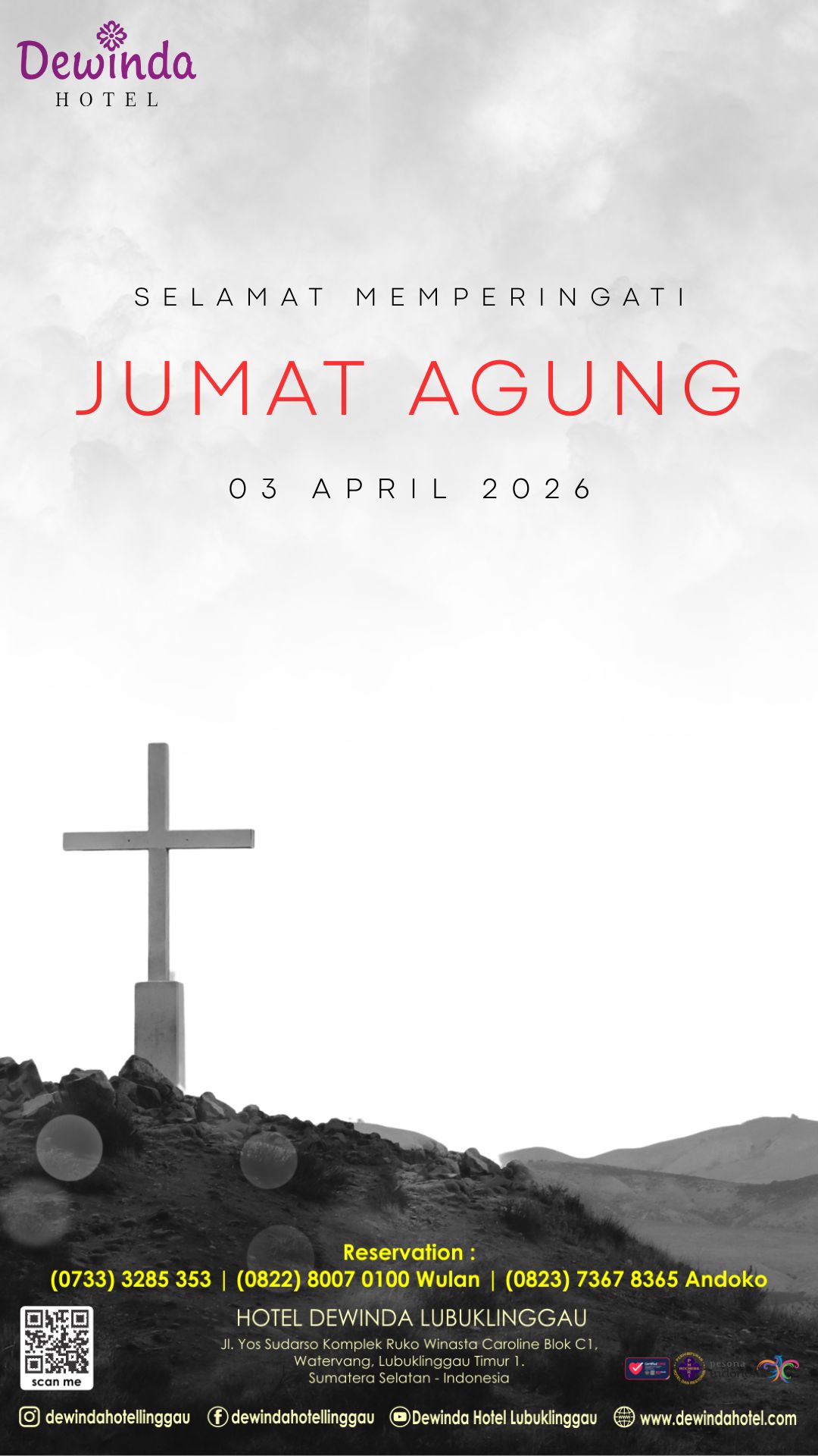 Kami dari Management Dewinda Hotel Lubuklinggau mengucapkan Selamat Memperingati Hari Jum’at Agung 03 April 2026. For more information, contact our staff :Reservation Room : (0733 3285 353) / (0812-4618-5855) EdwinSales Executive :(0821 8007 0100) Wulan #dewindahotellubuklinggau#jojoskylounge#justinmeetingroom#elisameetingroom#feliciameetingroom#graceballroom#hotellubuklinggau#hotelterbaiklubuklinggau#dewindaterbaik