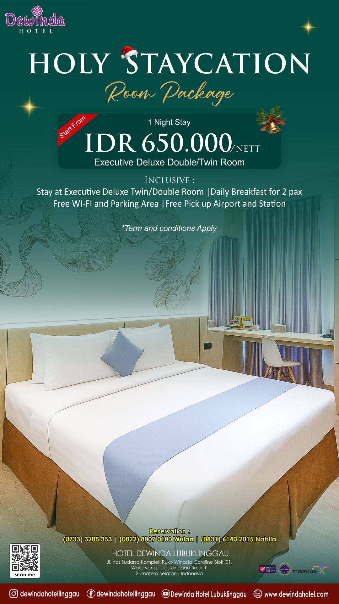 Saatnya recharge energi & manjakan diri dengan momen liburan yang nyaman tanpa perlu pergi jauh.Nikmati pengalaman menginap yang hangat dan penuh kenyamanan di Executive Deluxe Room Dewinda Hotel Lubuklinggau — pilihan terbaik untuk quality time bareng pasangan, sahabat, atau keluarga tercinta. 💚 ✨ Start From hanya IDR 650.000 NETT / malamTermasuk:🍳 Daily Breakfast untuk 2 […]